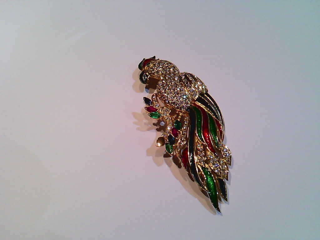 Alfinete de Peito em Ouro (800) Arara com Diamantes talhe de brilhante c +-3ct. grau HJ VVS1. Safiras. Esmeraldas. Rubis e Esmalte de cores Peso- 24.6g