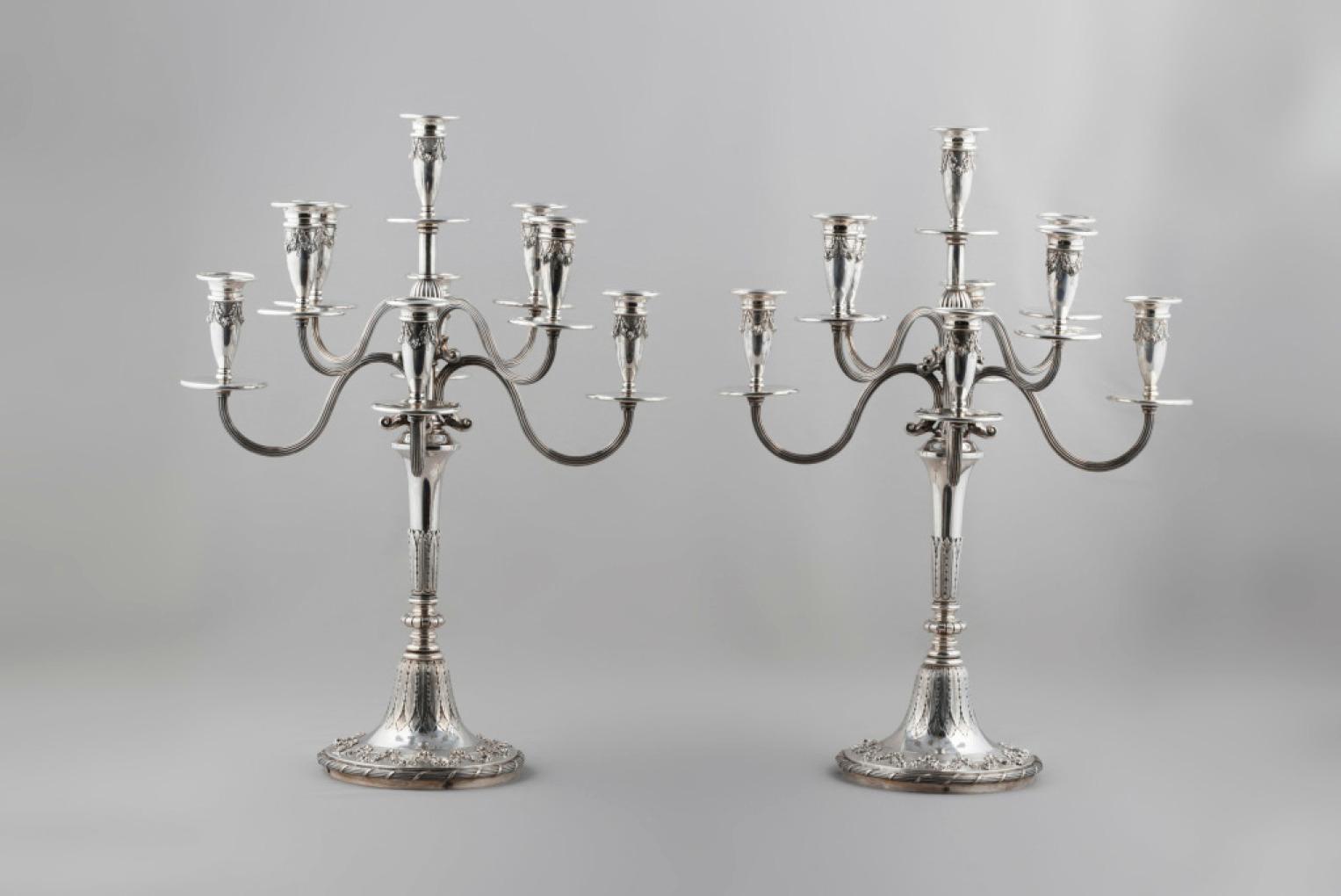 Par de candelabros de 9 lumes. prata (915). p.javali. 1ºtítulo. m. Leitão&Irmão. séc. XIXXX. 8.350g